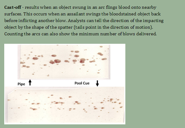 "When interpreting bloodstain patterns at crime scenes, identifying the presence of saliva in possible expirated blood may assist in determining whether a pattern has been caused by the blood being expirated or from impact spatter. Expirated blood patterns are typically formed by a person suffering from a serious head wound or internal injury,coughing or sneezing blood droplets onto nearby surfaces. The resultant spray pattern can consist of distinct small stains or spots. A similar pattern of small blood droplet stains can be formed on nearby surfaces when a blunt force such as a weapon impacts a bloodied surface resulting in impact spatter."